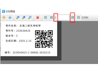 5. 制作完成之后,点击软件顶部的“打印”按钮,在打开的窗口中设置数据量为300,开始页码为1,点击结束页码后面的尾页,然后点击下面的“预览”按钮,翻页查看批量生成的流水二维码标签,预览无误就可以直接连接打印机打印出来了。